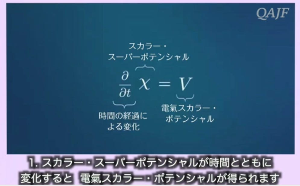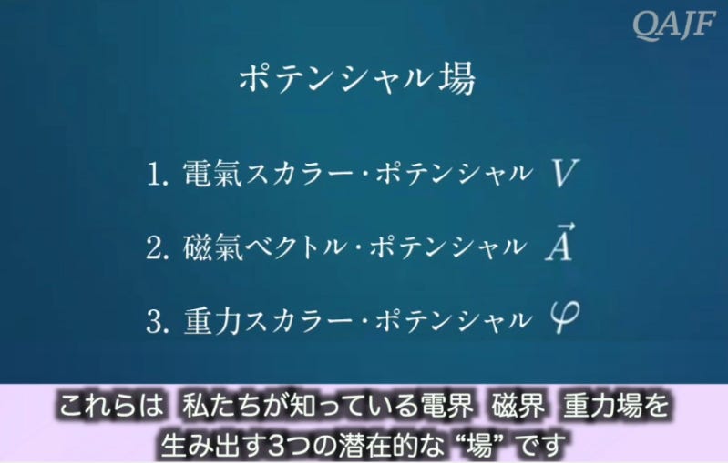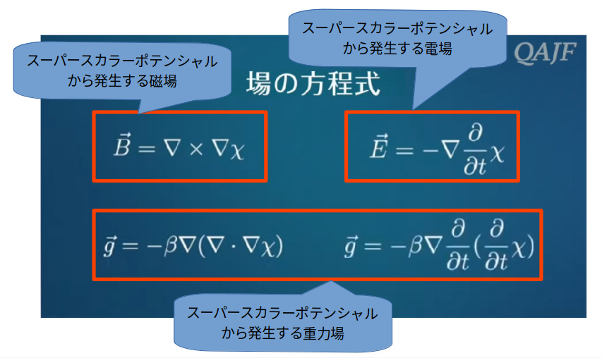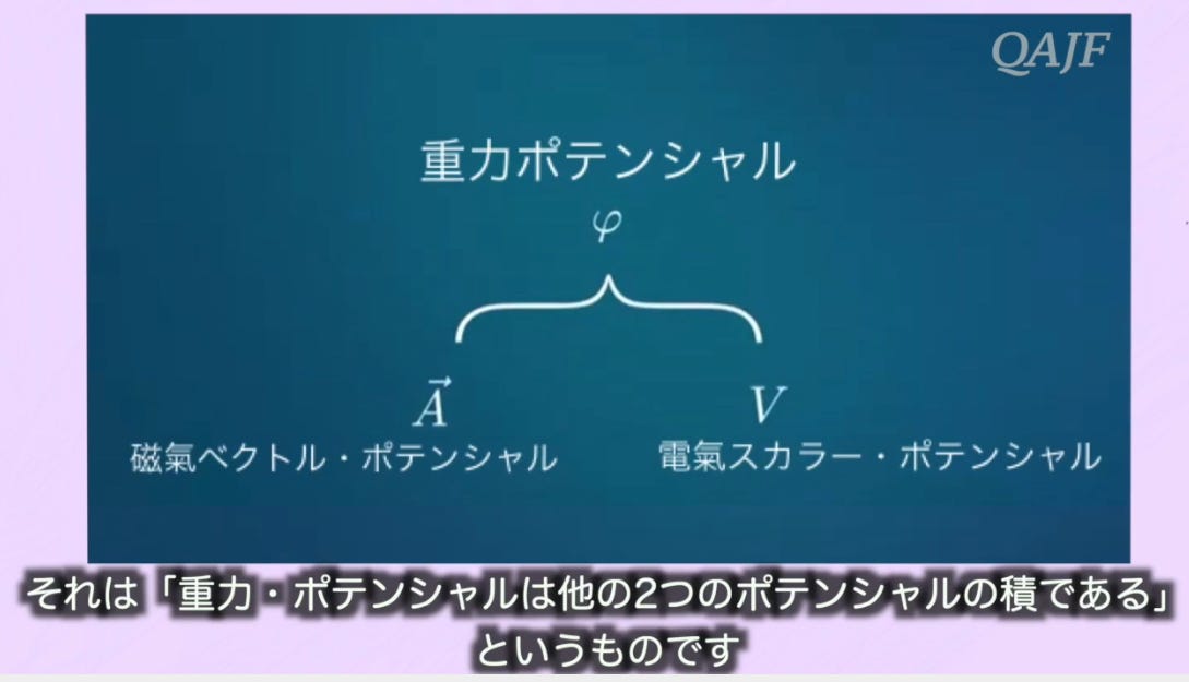 動画で紹介されている話の流れでは、最終的にスーパースカラーポテンシャルで表現された電氣ポテンシャル、ベクトルポテンシャル、重力ポテンシャルは以下になります。