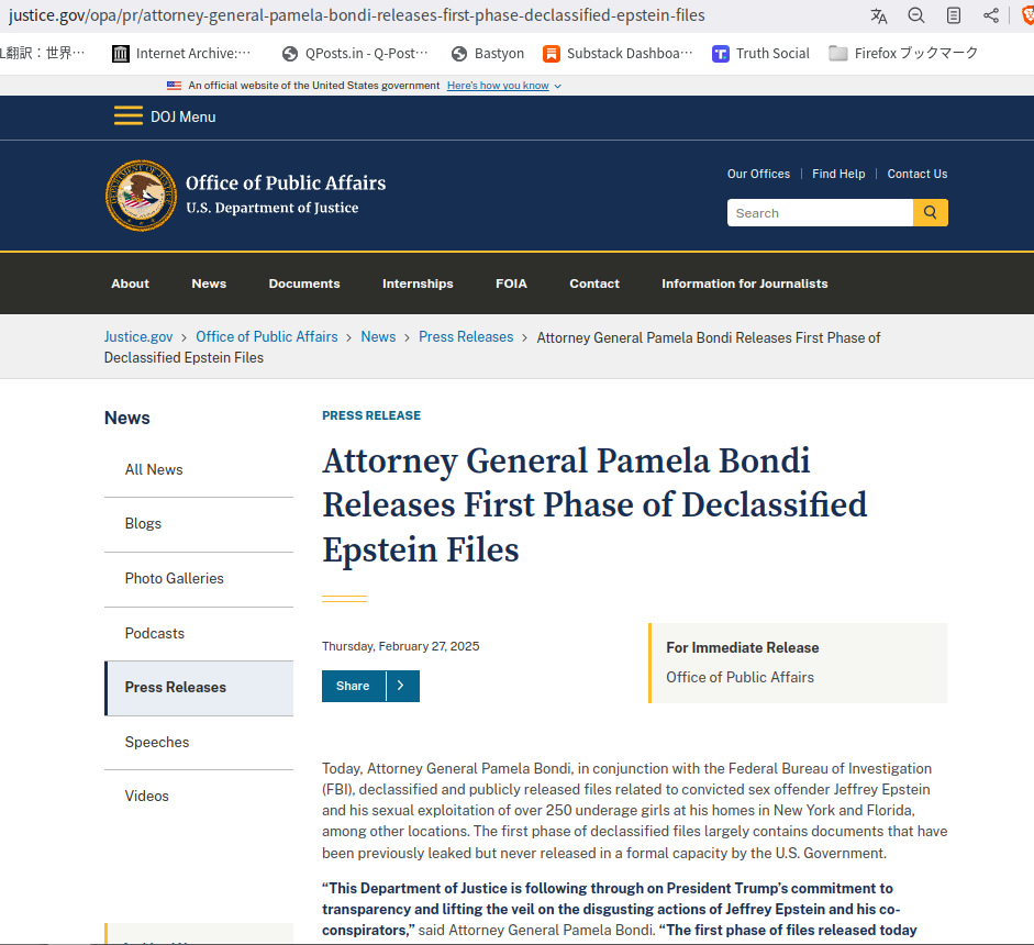 司法省がエプスタインファイルを公開し始めました!