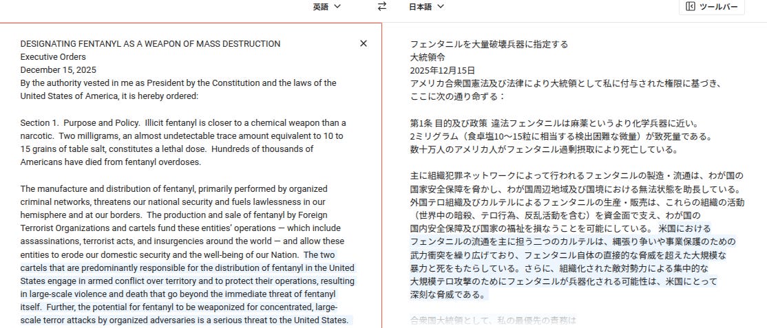 2025/12/15 米国政府からフェンタニルを大量破壊兵器に指定する大統領令が公布されました!
