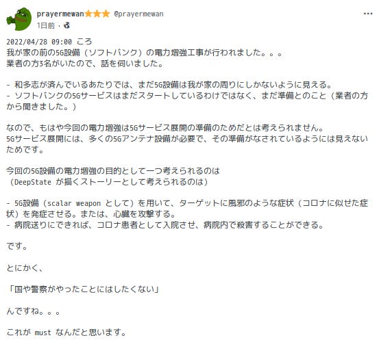 実際このgab投稿後、うちの近くの4G、5G設備から来る scalar wave による咳の症状(もはや風邪ではなく刺激によるものです)が一時的に発生し、心臓にもダイレクトに攻撃が来るようになりました。。。