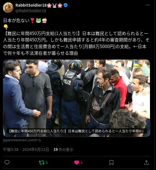 【難民に年間450万円支給(1人当たり)】日本は難民として認められると一人当たり年間450万円。しかも難民申請すると約4年の審査期間があり、その間は生活費と住居費含めて一人当たり[月額8万5000円]の支給。←日本で何十年も不法滞在者が暮らせる理由https://x.com/RabitSoldier18/status/1800809930448056637