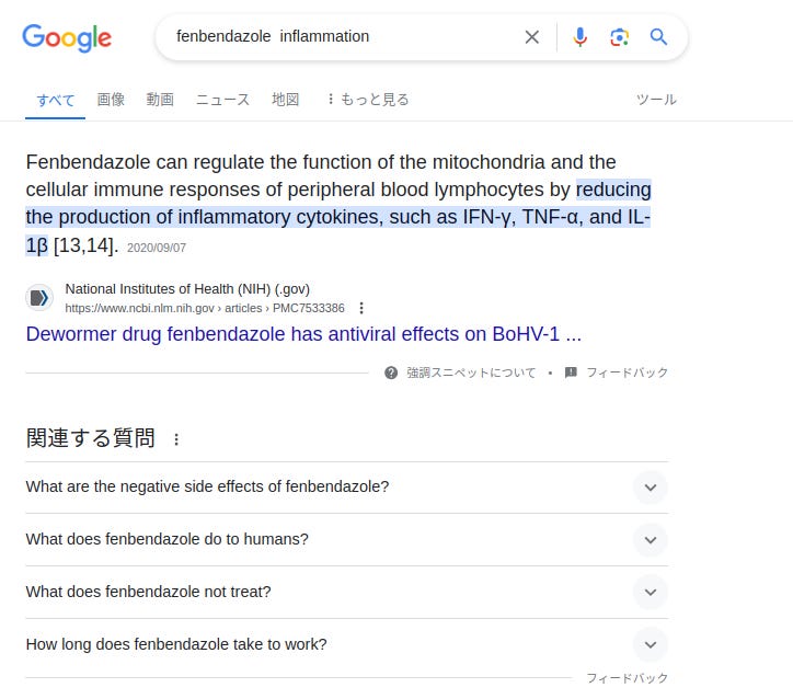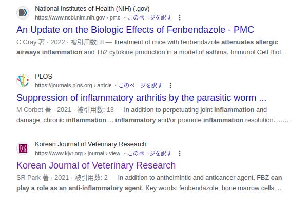 "fenbendazole", "inflammation"(「炎症」の意味)