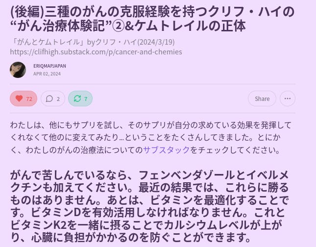 さらにさらに、ちょっと汚い話になりますが、解毒は便などで身体に入った悪いものを排出しますが、フェンベンダゾールを飲んだ後の解毒の便は、ケムトレイル臭がいつもよりきつくなりました。。。それだけ、解毒・排出されたということになります!