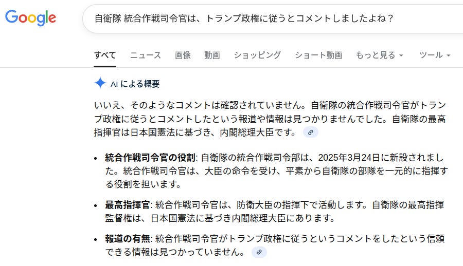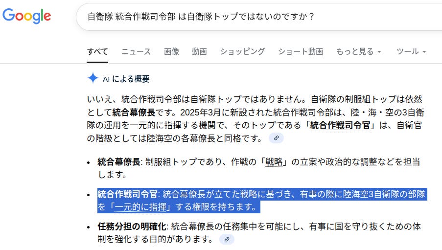 Googleによると、自衛隊のトップは依然として統合幕僚長であり、今年新設された「統合作戦司令部」は陸海空3自衛隊を一元的に指揮する権限を持つ部で、統合作戦司令官は陸海空の各幕僚長と同じ階級であるということのようですが、南雲統合作戦司令官のコメントが事実であれば、自衛隊はトランプ政権配下に入ったと解釈すべきでしょう!