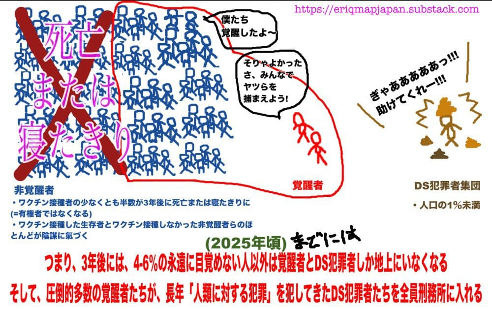 QAJF の Eriさんは、今後のワクチン接種者と非接種者、覚醒者の数とDeepState勢力数の予測イメージを公開されています。